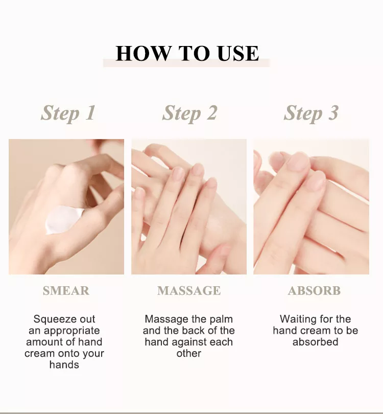 Kem dưỡng da tay giảm đau tức thì hấp thụ nhanh có kết cấu dạng kem tương tự như sữa,Đây là cách sử dụng sản phẩm: